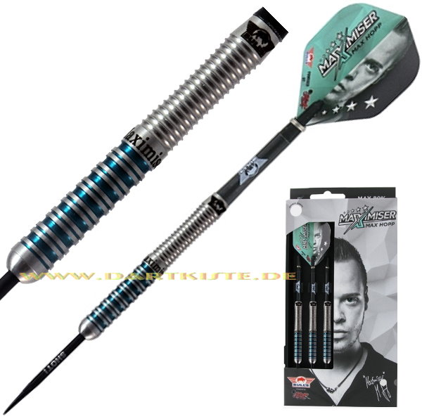 Die Bull's Max80 sind ein Dartset mit Barrels die mit 80% Tungsten speziell angefertig sind für den Profidarter Max Hopp. Der Frontgrip des Darts hat eine türkis Ummantelung. Dieses Dartset wird in zwei Gewichten geliefert 22-24g. Die Max Hopp 80% Tungsten Darts haben einen speziellen Grip der scharf ist und für einen festen Halt sorgt. Der hintere Teil des Darts hat eine Griffmulde. Das Dartset wird Standart geliefert mit Bull's Powerflite Half Face dazu, schwarze Bull's inbetween Shafts und von Shot gelaserten schwarze Spitzen die in dem Dart sitzen (35mm). Jeder Max 80% Dart hat das Bull's Logo und eien Maximiser eingravierung.