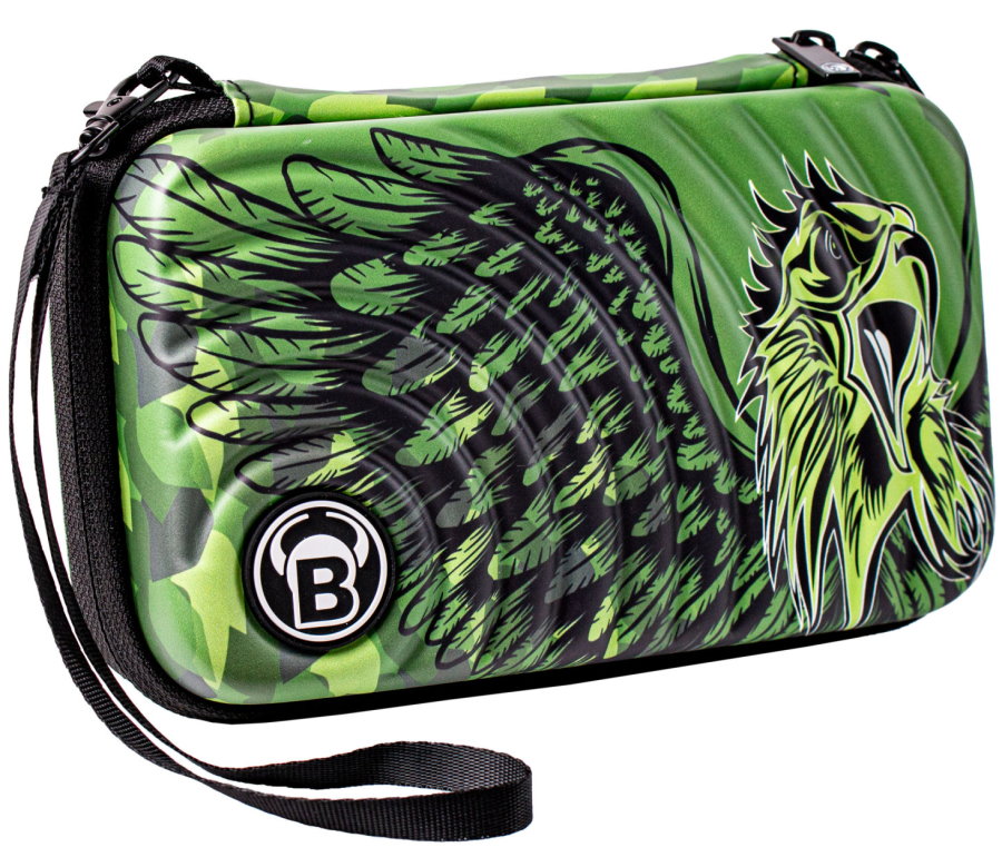 Nach den beliebten ersten beiden limited Editionen, ist jetzt die dritte limitierte Auflage des BULL'S Orbis da. Das einzigartige Eagle-Camouflage-Design des Cases in hochwertigem EVA-Material ist erhältlich in S und XL. Die Größe XL misst 190 x 110 x 50 mm und beinhaltet eine Schaumstoffhalterung für zwei komplette Dart-Sets, sowie zwei Innenseiten für 12 Sätze Flights. Eine Seite besitzt Halterungen für 15 Schäfte und auf der anderen Seite befindet sich eine verschließbare Netztasche für Soft-Tips & Zubehör.