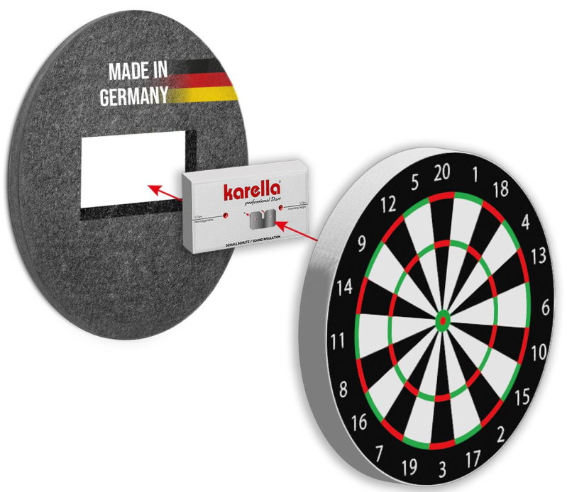 Dartpfeile erzeugen beim Auftreffen auf dem Board ein „Klopfgeräusch“, das teilweise als sehr störend im eigenen Umfeld oder vom Nachbarn wahrgenommen werden kann. Zusammen mit Schallschutzexperten hat Karella jetzt die perfekte Lösung, um das Geräusch fast vollständig zu eliminieren. Auf eine solche Erfindung haben Dartspieler schon lange gewartet.